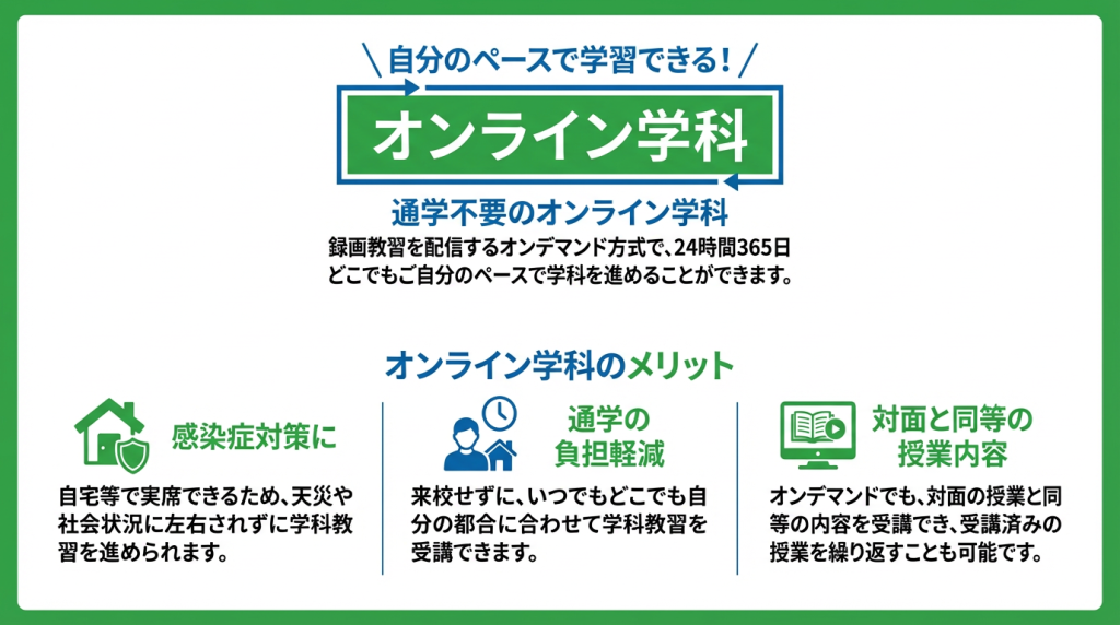 オンライン学科を受講する場合は下記リンクより「オンライン学科教習マニュアル動画」の視聴と、「オンライン学科教習のご案内」を一読し同意した上で下記バナーより受講ください。